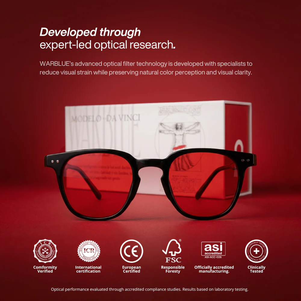 At night, wear Da Vinci (red lenses) to block harmful blue light and prepare your body for deep, restful sleep.